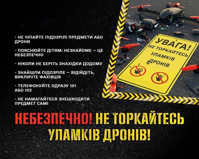 УВАГА: НЕ ТОРКАЙТЕСЯ УЛАМКІВ БЕЗПІЛОТНИКІВ ТА ПІДОЗРІЛИХ ПРЕДМЕТІВ!